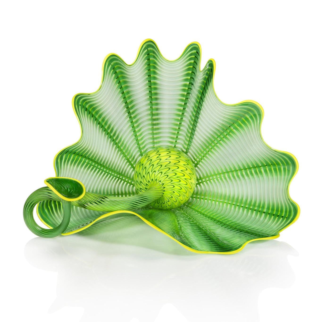 An exploration of vibrant green hues from Kelly green to chartreuse, the 2025 Green Apple Persian Studio Edition features a palette animated by textural and formal contrasts. A ribbed, scalloped rondel cradles a second element, whose scale pattern and elongated form stretch beyond the lemon-yellow lip wrap that defines the edge of this graceful composition.